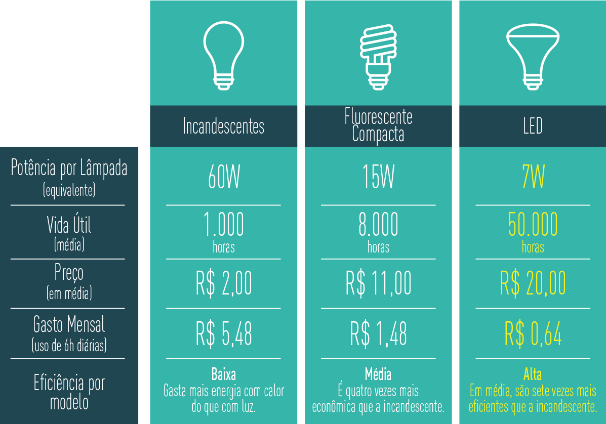 O uso de iluminação LED permite reduzir o consumo de energia elétrica em cerca de 90% em relação a uma lâmpada incandescente comum e, em cerca de 50%, em relação as lâmpadas fluorescentes.