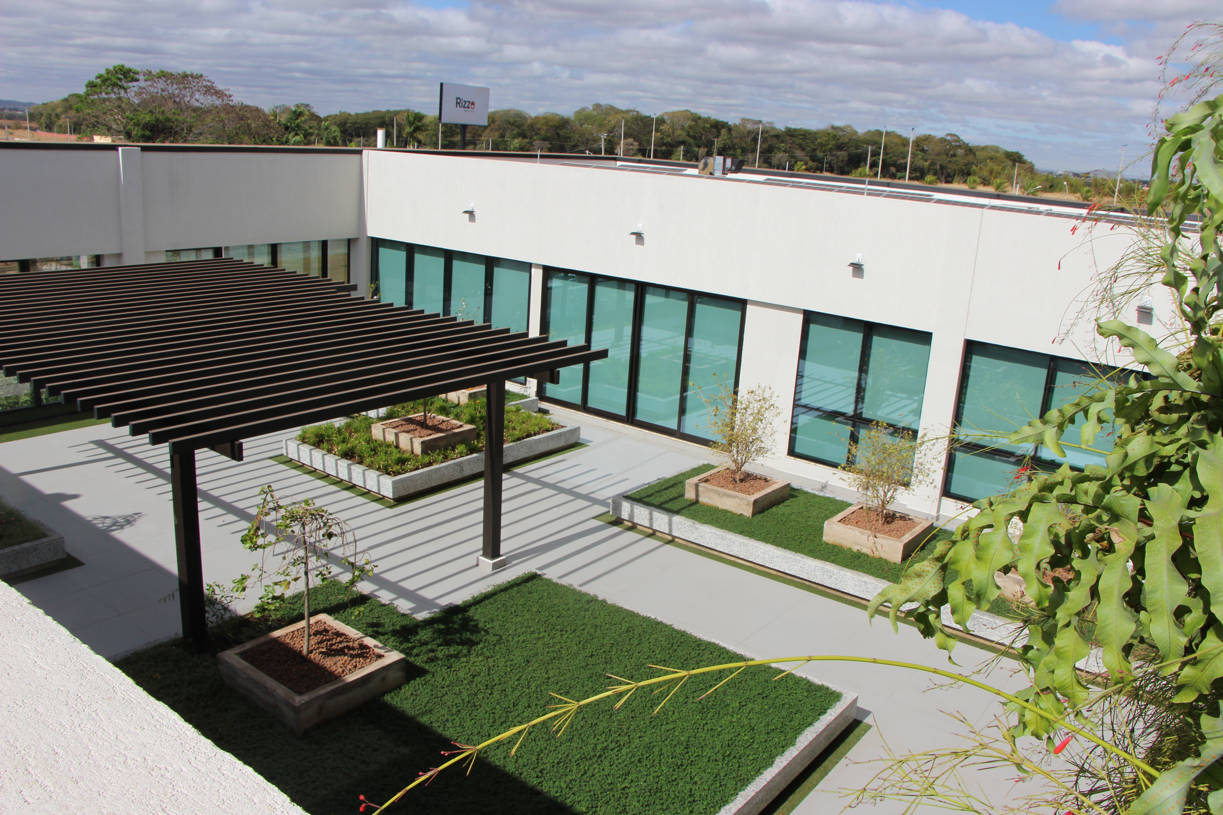 São 949,13m² de área de paisagismo, divididas em zonas, conforme necessidade hídrica das espécies. A irrigação das áreas é feita com água da chuva e águas cinzas de reuso tratadas, com irrigação automática, controlada por sensores de umidade e chuva.